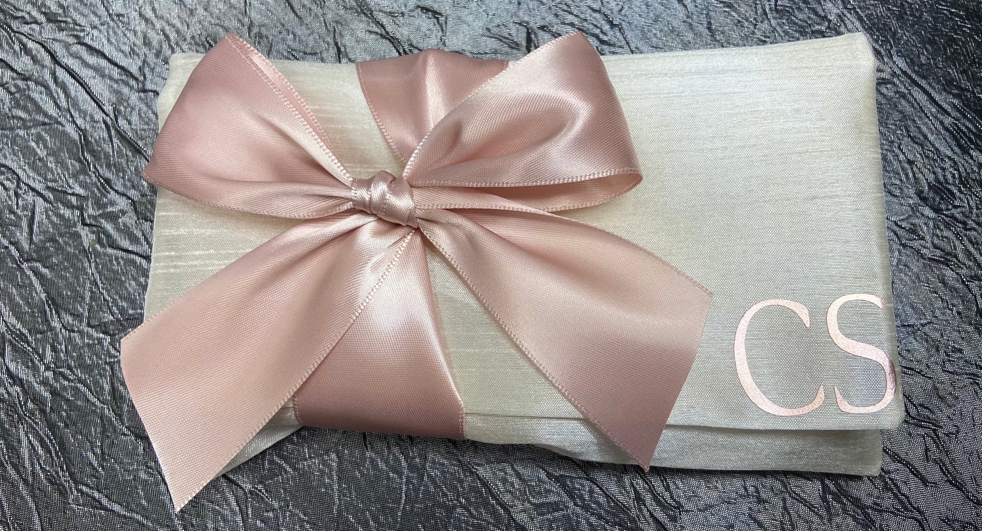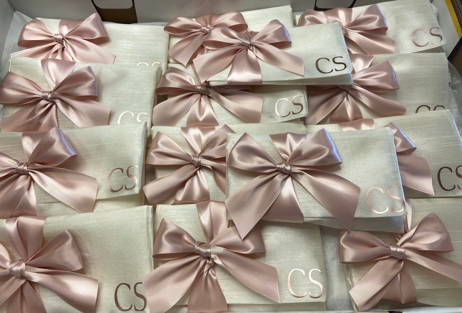 Off white silk envelope with monogram detail, hand tied satin bow.