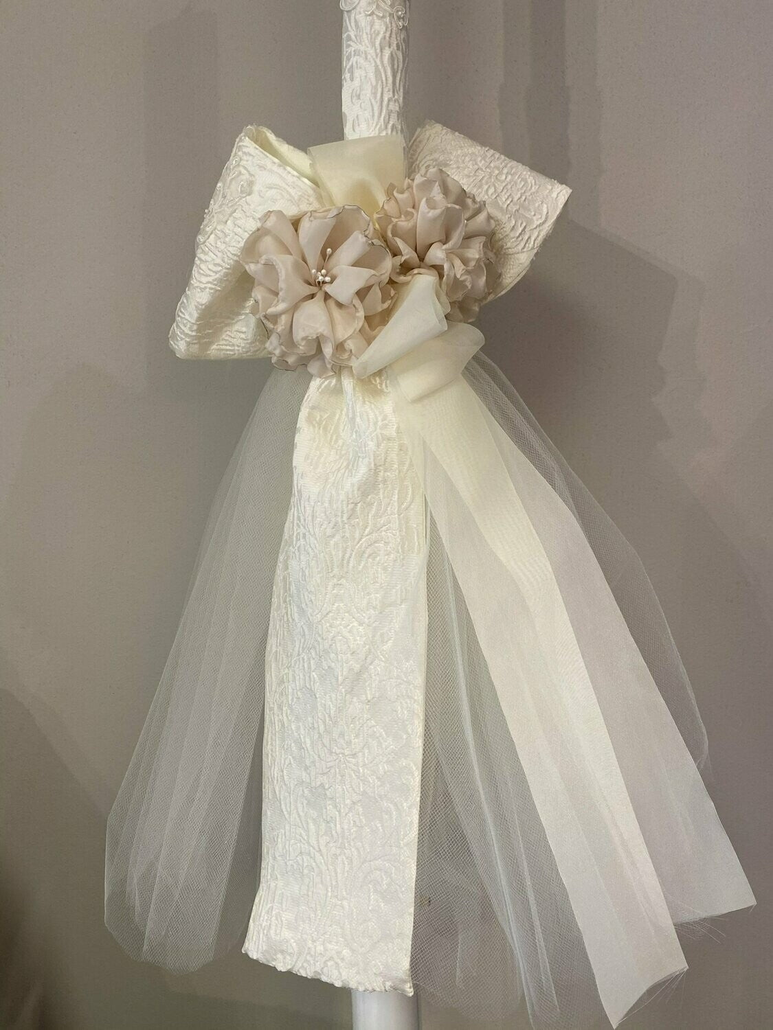 Ivory brocade with handmade beige flowers. The set of lambades includes 1 large and 2 small coordinating 18 inch lambades.