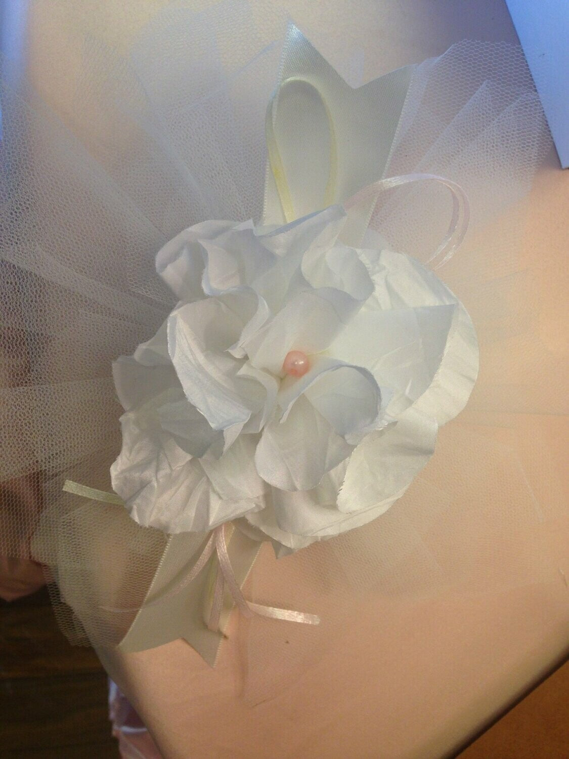 Crushed ivory fabric handmade flower with pearl embellished center and five individually wrapped koufeta.