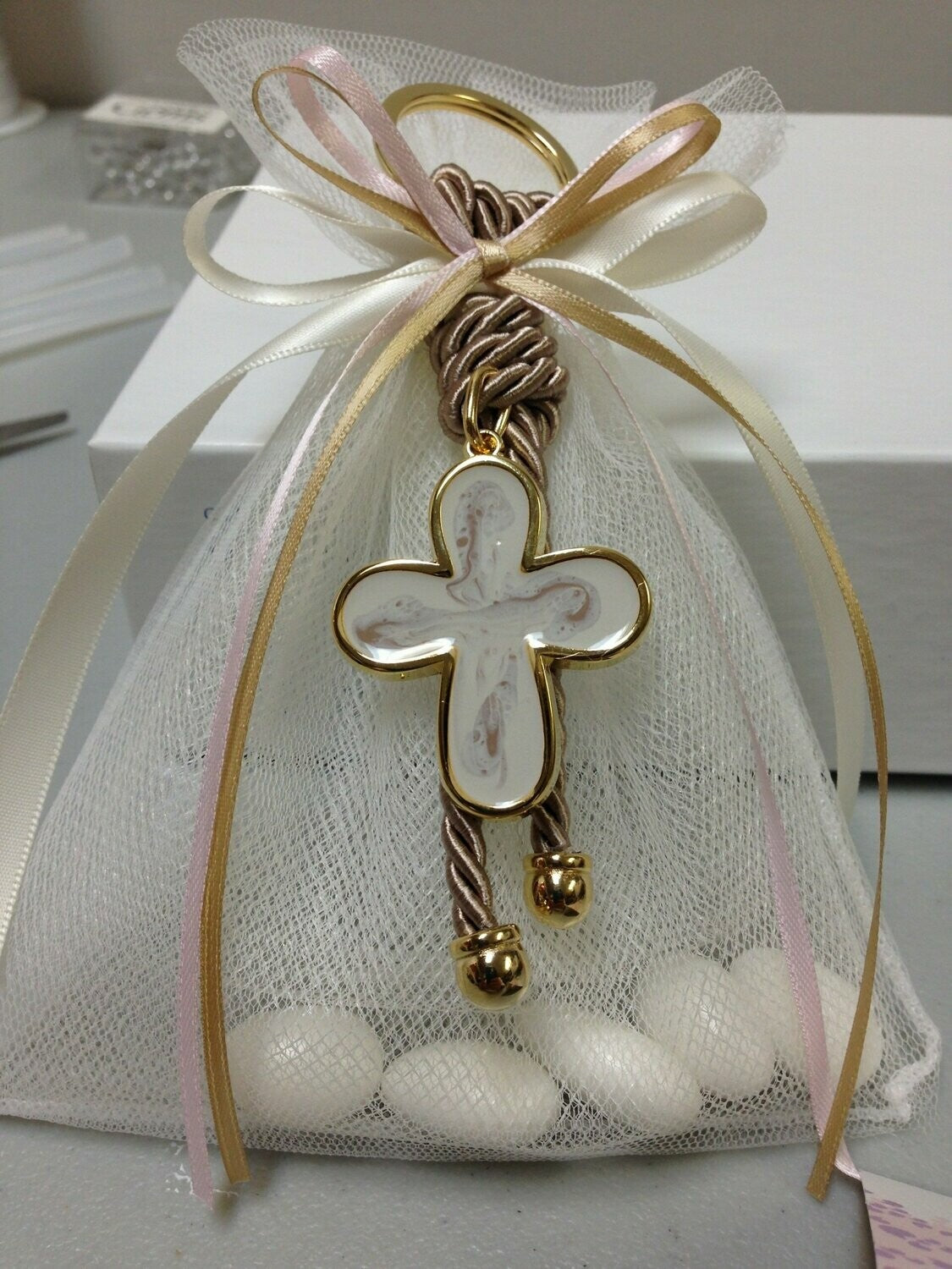 Ivory tulle pouch with champagne corded keychain and ivory enamel cross.
