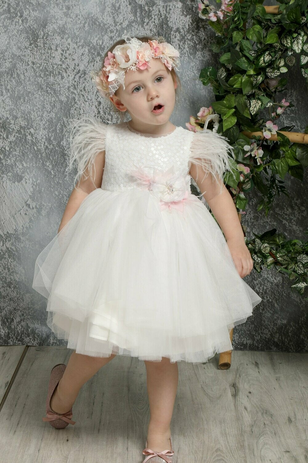 Each Mi Chiamo baptismal gown is unique and distinguishes itself for its high quality and craftsmanship. Our collection is designed in a variety of colors and textures, while still capturing the elegance and beauty of each garment. Each garment is HANDMADE in Greece, comes with a coordinating bonnet and bolero jacket. This gown is made with duchess satin, pink tulle ruffles at sleeves, handmade flowers and gorgeous luxurious bow on back.