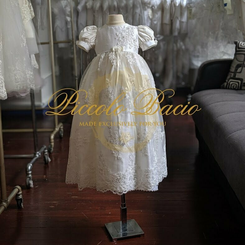 Each Piccolo Bacio gown is proudly made in the USA. Fine silks, laces, pearls and Swarovski crystals embellish these gorgeous heirloom pieces.