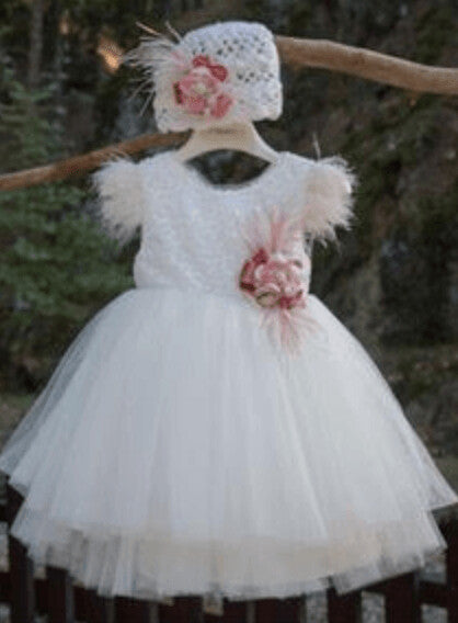 Each MiChiamo baptismal gown is unique and distinguishes itself for its high quality craftsmanship. Our collection is designed in a variety of colors and textures, while still capturing the elegance and beauty of each garment. Each garment is HANDMADE in Greece, comes with a coordinating bonnet and bolero jacket. Ivory tulle gown accented with ostrich feathers and knit hat, and floral embellishments.