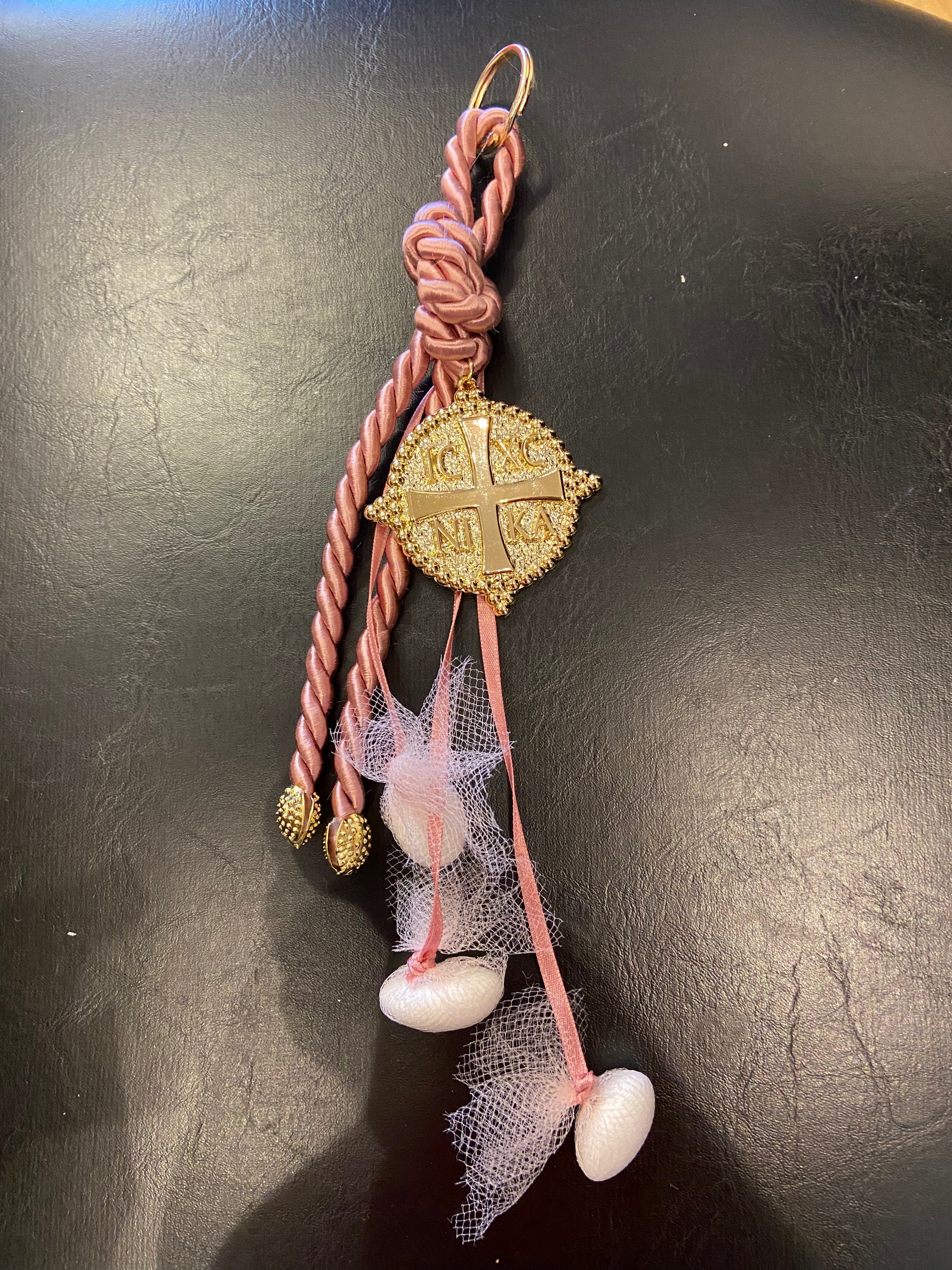- Gold plated byzantine kostandinato coin with dusty rose cord.