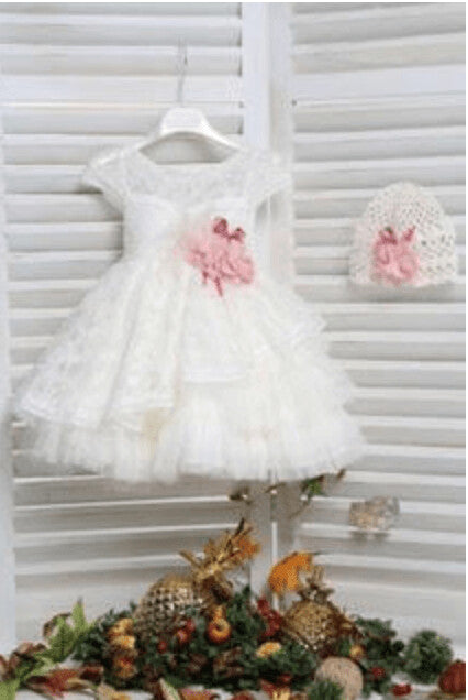 Each MiChiamo baptismal gown is unique and distinguishes itself for its high quality craftsmanship. Our collection is designed in a variety of colors and textures, while still capturing the elegance and beauty of each garment. Each garment is HANDMADE in Greece, comes with a coordinating bonnet and bolero jacket. K4165E is an ivory gown with tiered tulle bottom and illusion top, and handmade floral embellishments and faux fur bolero to match.