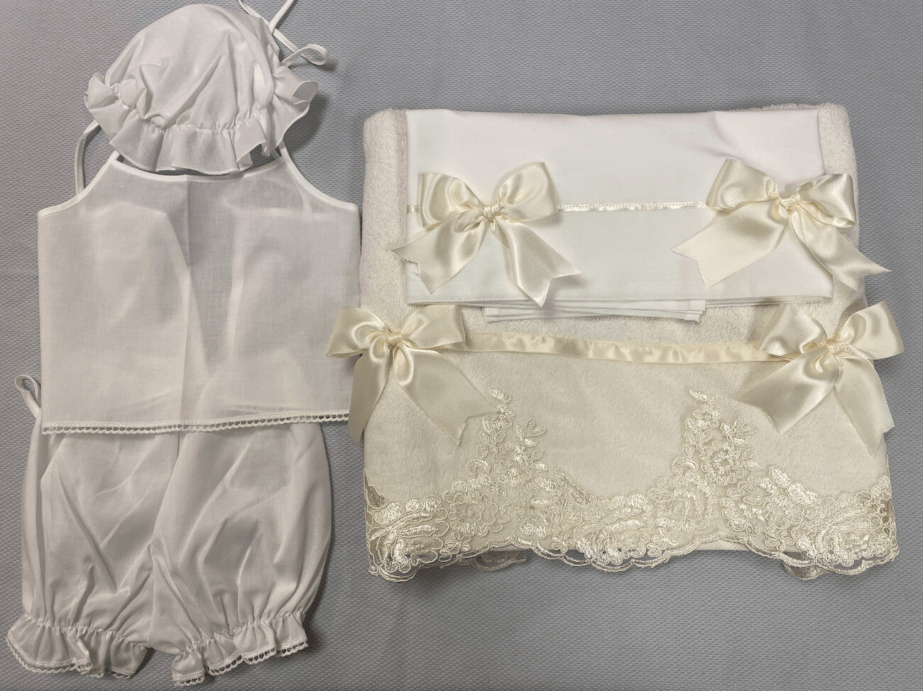 Our ladopana sets are made with 100%cotton OEKO-TEX textiles and are imported from Greece. Each set consists of all the pieces needed for the Sacrament of Baptism. One large bath towel, cotton sheet, 2 small towels, an oil hat, camisole, bloomers and a disposable diaper lined with cheesecloth. The cheesecloth is to be washed with the rest of the ladopana. Tradition states these items should be washed by hand and the water thrown in the garden. To customize any of our ladopana sets please contact us.