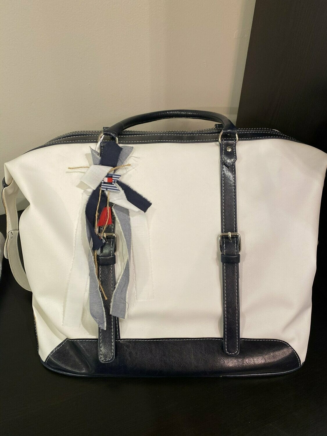 Large white vinyl baptismal bag with navy faux leather bottom and nautical embellishments