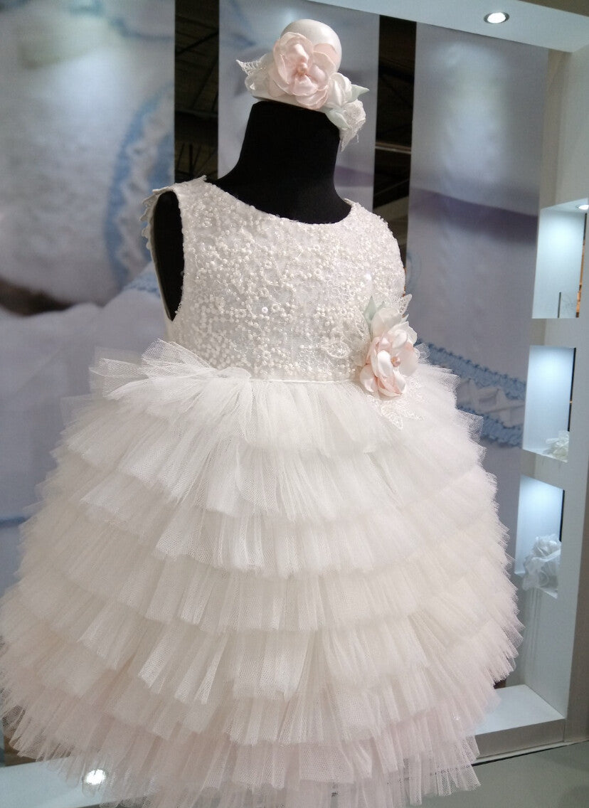 Each MiChiamo baptismal gown is unique and distinguishes itself for its high quality craftsmanship. Our collection is designed in a variety of colors and textures, while still capturing the elegance and beauty of each garment. Each garment is HANDMADE in Greece, comes with a coordinating bonnet and bolero jacket. A beautiful tiered tulle ivory gown in ombre shades of very light pink at bottom.