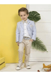 Each Mi Chiamo baptismal gown is unique and distinguishes itself for its high quality craftsmanship. Our collection is designed in a variety of colors and textures, while still capturing the elegance and beauty of each garment. Each garment is HANDMADE in Greece, comes with a bow tie or tie, hat and coordinating accessories. A4232S is coordinated with ivory pants, textured baby blue jacket, ivory cotton shirt, fabric bow tie and fedora hat.
