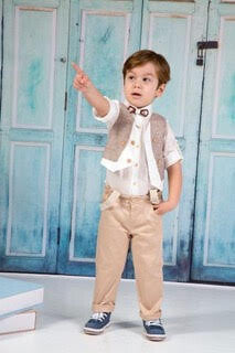 Each Mi Chiamo baptismal gown is unique and distinguishes itself for its high quality craftsmanship. Our collection is designed in a variety of colors and textures, while still capturing the elegance and beauty of each garment. Each garment is HANDMADE in Greece, comes with a bow tie or tie, hat and coordinating accessories. A4172 brown and ivory check vest, ivory linen shirt and pant comes with a fedora hat and wooden bow tie.
