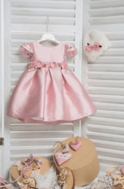 Each MiChiamo baptismal gown is unique and distinguishes itself for its high quality craftsmanship. Our collection is designed in a variety of colors and textures, while still capturing the elegance and beauty of each garment. Each garment is HANDMADE in Greece, comes with a coordinating bonnet and bolero jacket. K4162P is made of duchess silk satin with ostrich feather sleeve accents and handmade flowers, knit hat and luxurious, gorgeous organza bow on back.